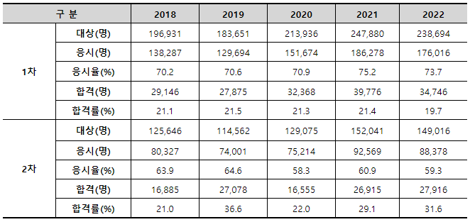 | 합격률 (%) | 21.1 | 21.5 | 21.3 | 21.4 | 19.7 | |