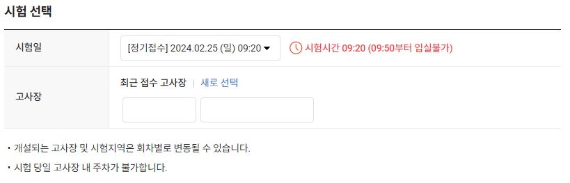 첫 번째 화면에서 원하는 고사장을 선택해 줍니다. 만약 이전에 봤던 이력이 있으면 당시 고사장이 떠있을 겁니다.